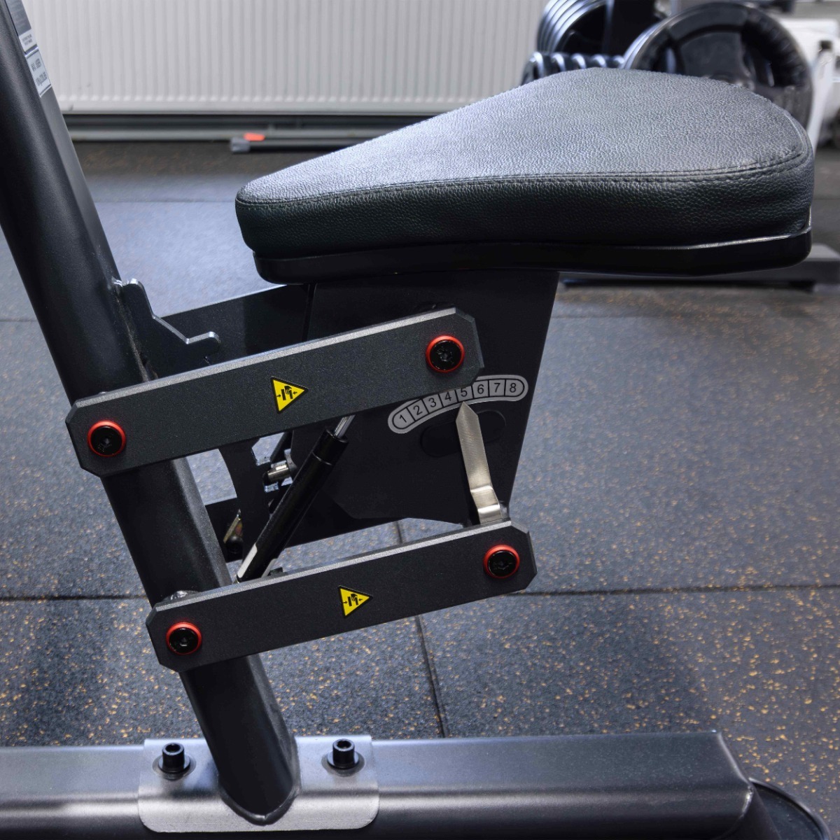 На раме тренажера закреплены двухуровневые опоры из пластика с четырьмя ложементами для фиксации штанги и предотвращения механического воздействия на раму и покрытие.