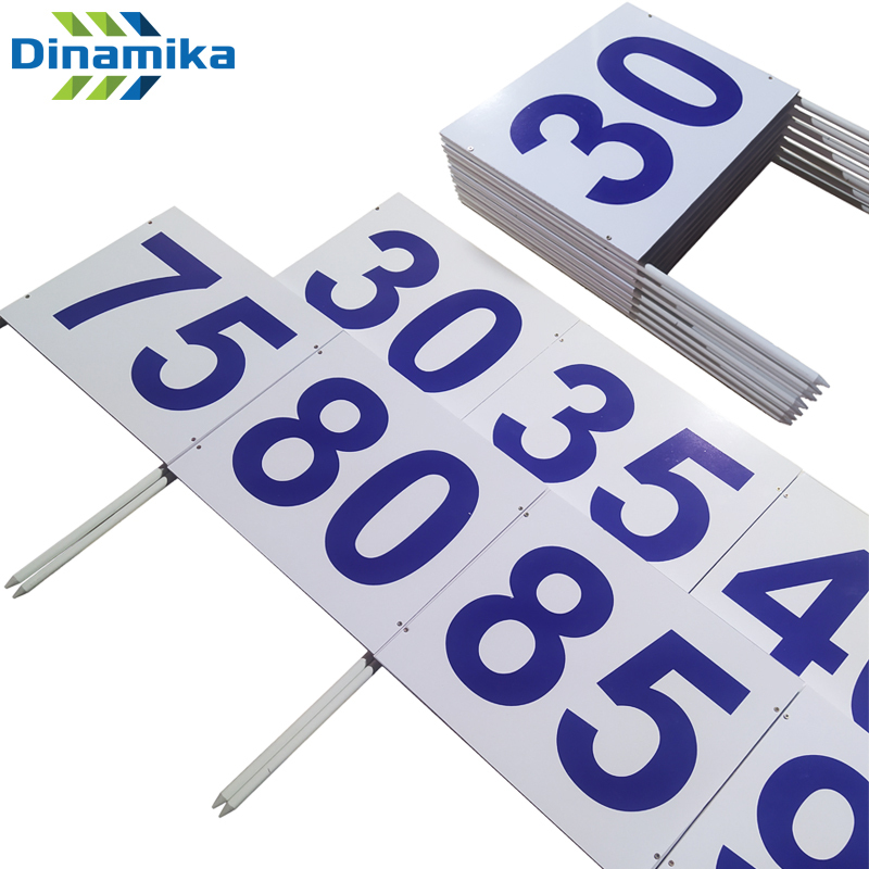 * Двусторонние таблички белого цвета с синими цифрами на обеих сторонах.