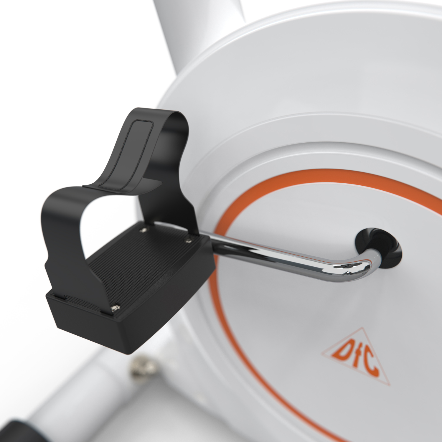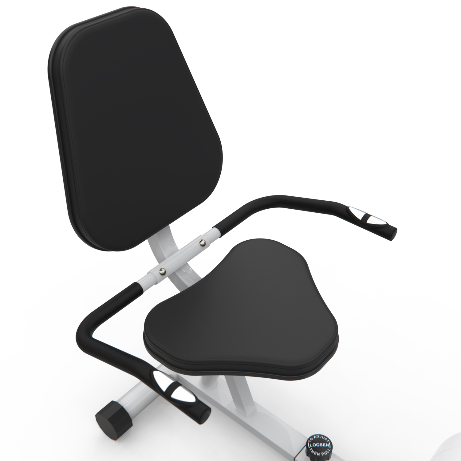 Большое сиденье со спинкой для людей разного возраста. Сиденье регулируется по длине с помощью рамы. Педали с фиксирующими ремнями.