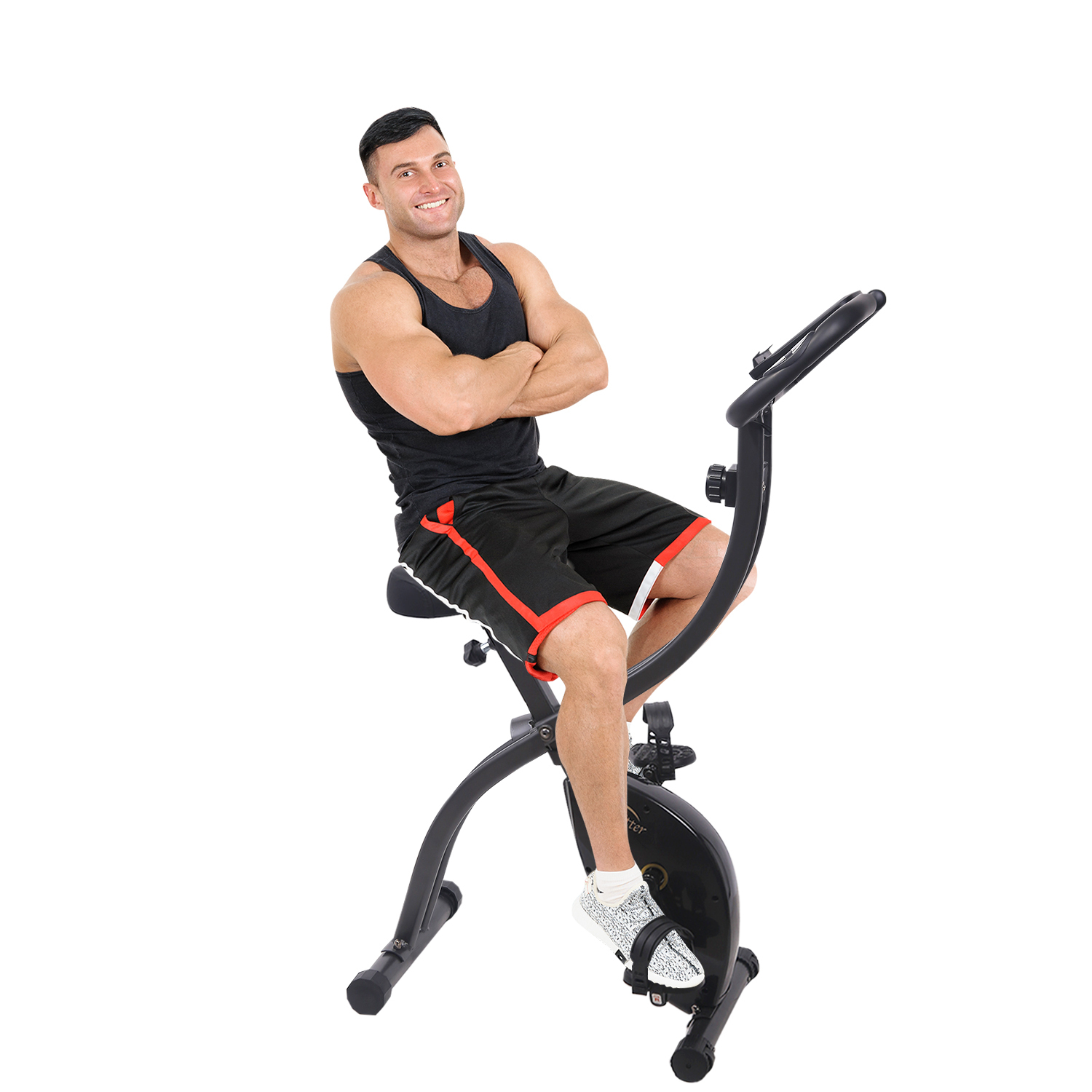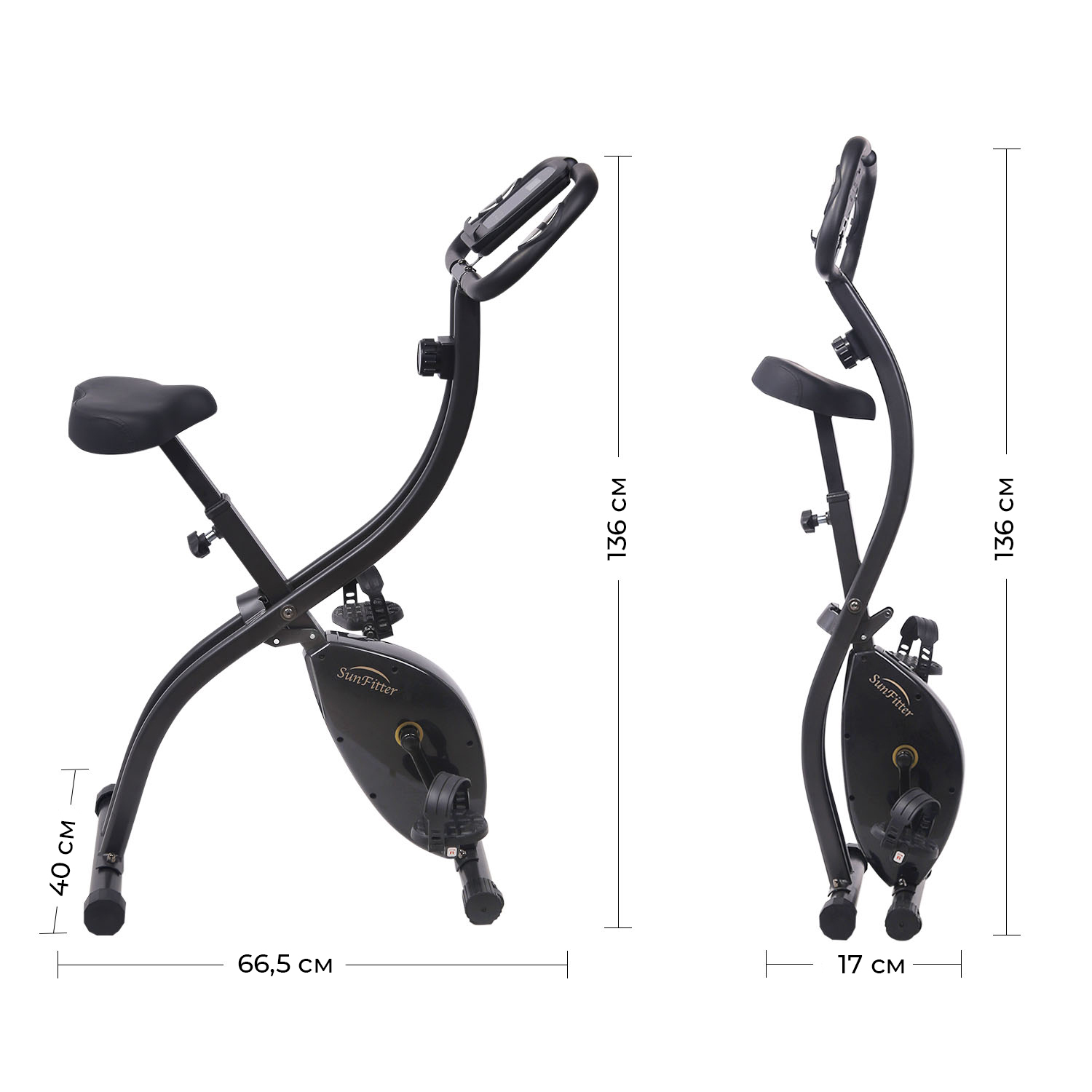 Отличительной чертой SUN FITTER является складная конструкция: в сложенном виде тренажёр занимает всего 17 см по длине. Транспортировочные ролики на передних ножках предусмотрены для лёгкого перемещения по дому. Компенсаторы неровности пола на задних ножках велотренажёра обеспечат комфортные тренировки в любом помещении.