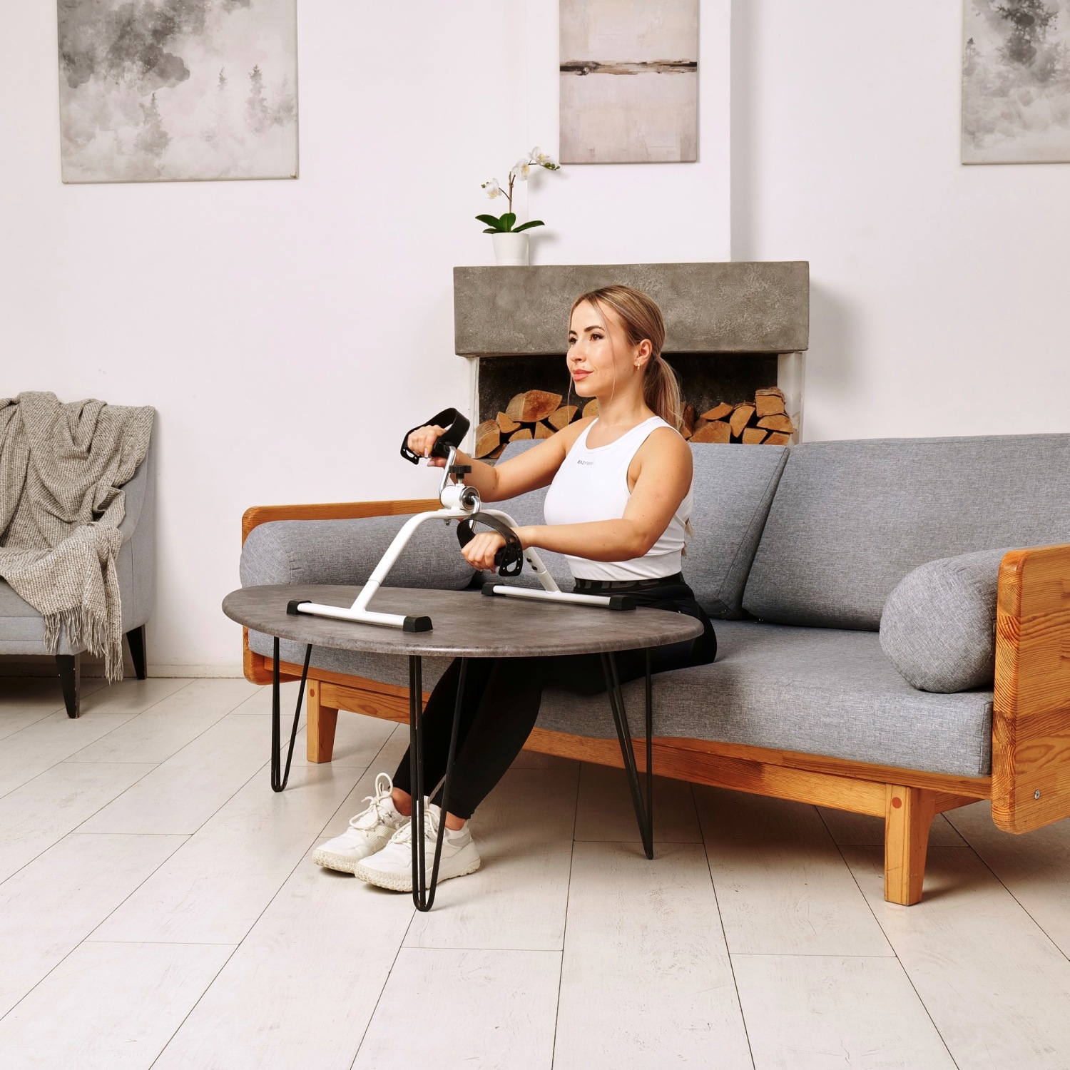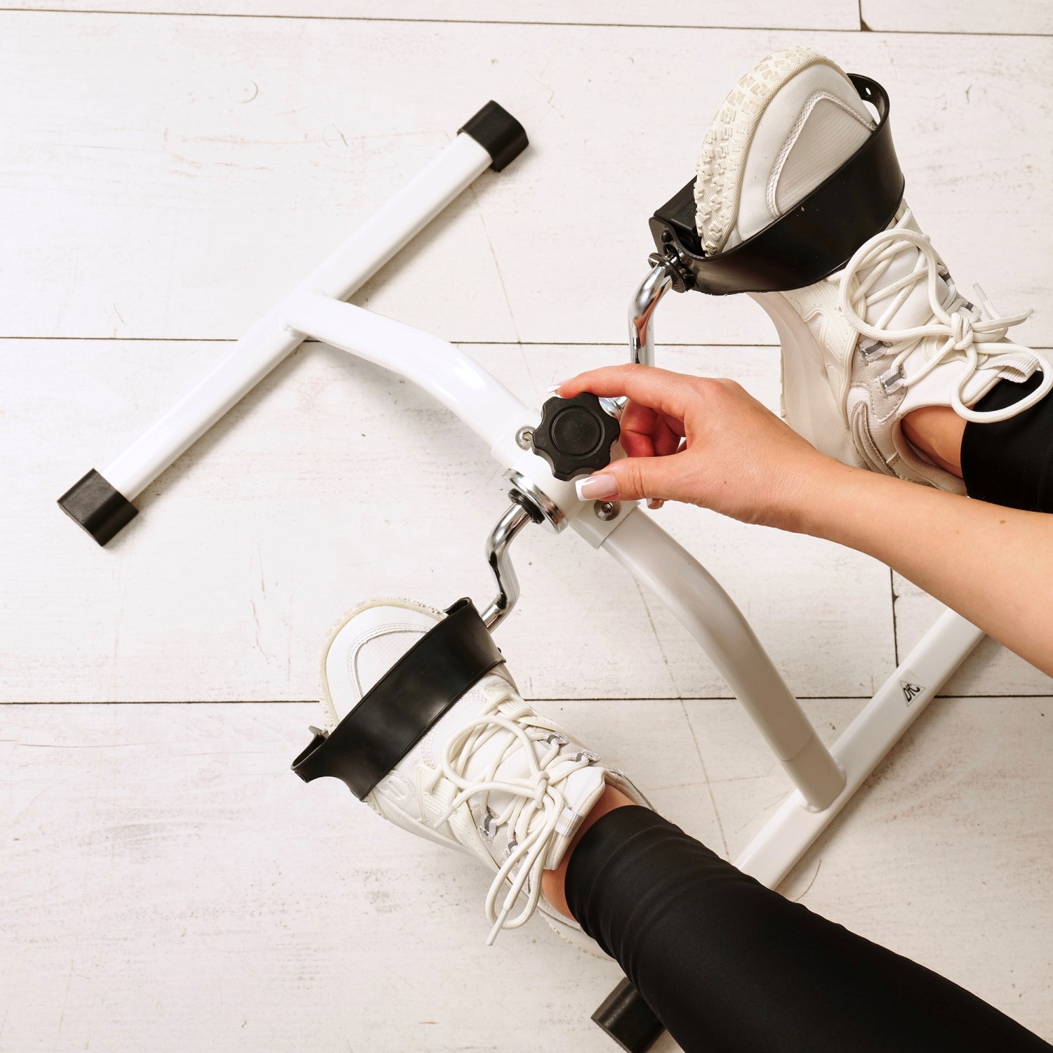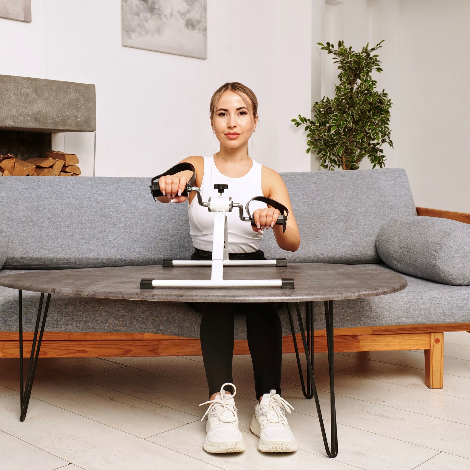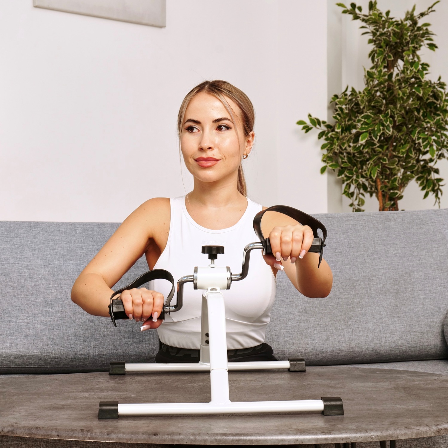 Самый простой и надежный мини-велотренажер W003XW белого цвета для домашних тренировок. Идеально подходит для тренировки рук и ног. Быстро изменить нагрузку во время тренировки можно с помощью механической ручки.