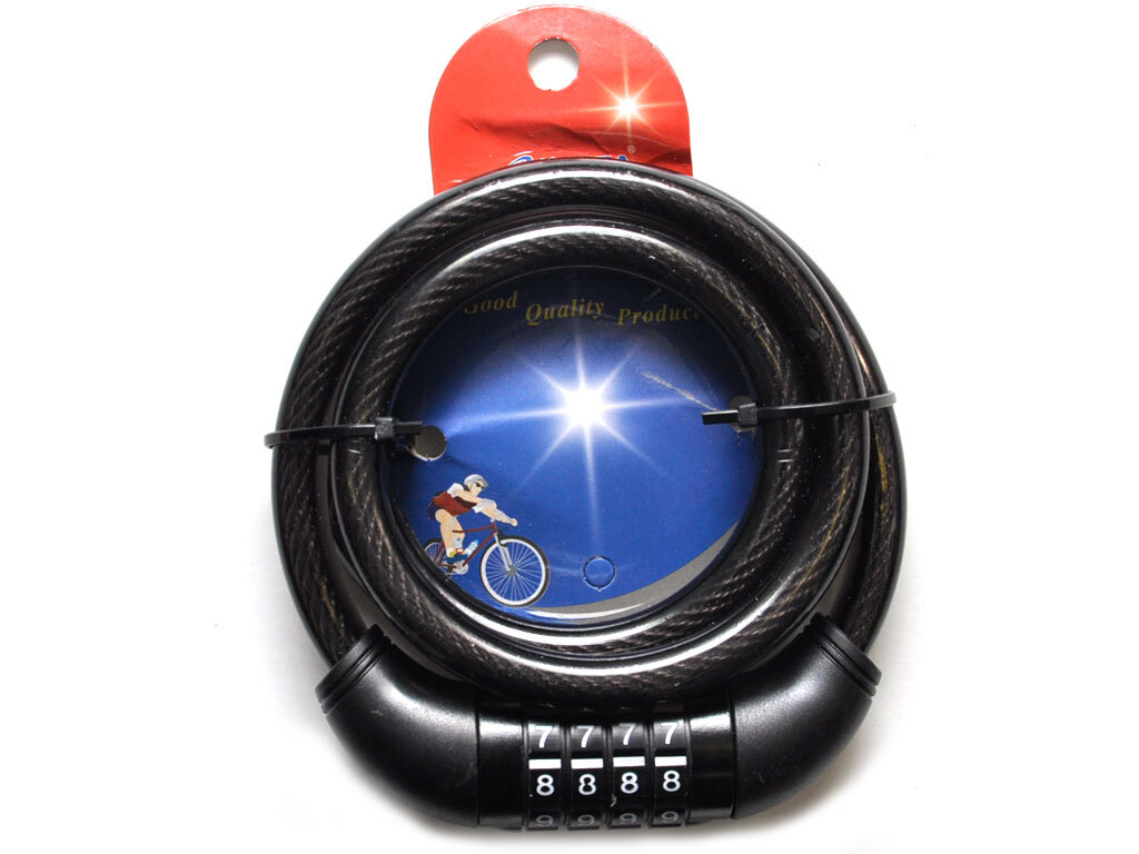 Кодовый велозамок со стальным тросом. Такой замок обеспечит защиту от краж в общественных местах велосипедов, колясок, мопедов. Транспортное средство можно легко прицепить к надежной опоре или стационарным элементам парковки. Замок за счет своего небольшого веса удобно перевозить с собой и много места он не занимает. Благодаря своему кодовому замку, открыть отмычкой его невозможно и носить ключи с собой не нужно.