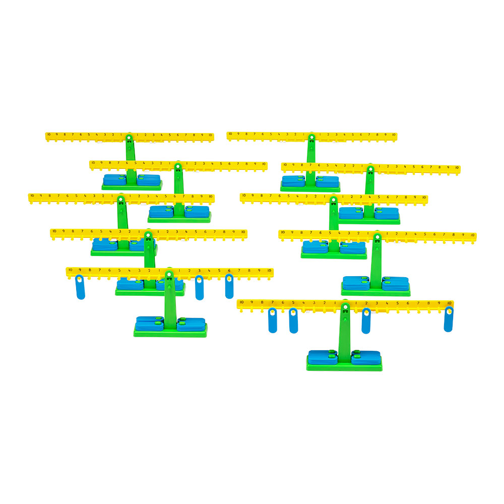 - 10 весов с нулевой отметкой и числовыми делениями от 1 до 10 в обе стороны (на верхней планке весов под каждой цифрой есть крючок для подвешивания грузиков)