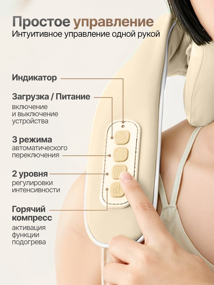 Устройство оборудовано удобной панелью управления с несколькими режимами работы и уровнями интенсивности, что позволяет индивидуально настроить процесс массажа под личные предпочтения. Также есть функция нагрева с тремя уровнями температуры: 40°C, 45°C и 52°C, что делает массаж более приятным и расслабляющим.