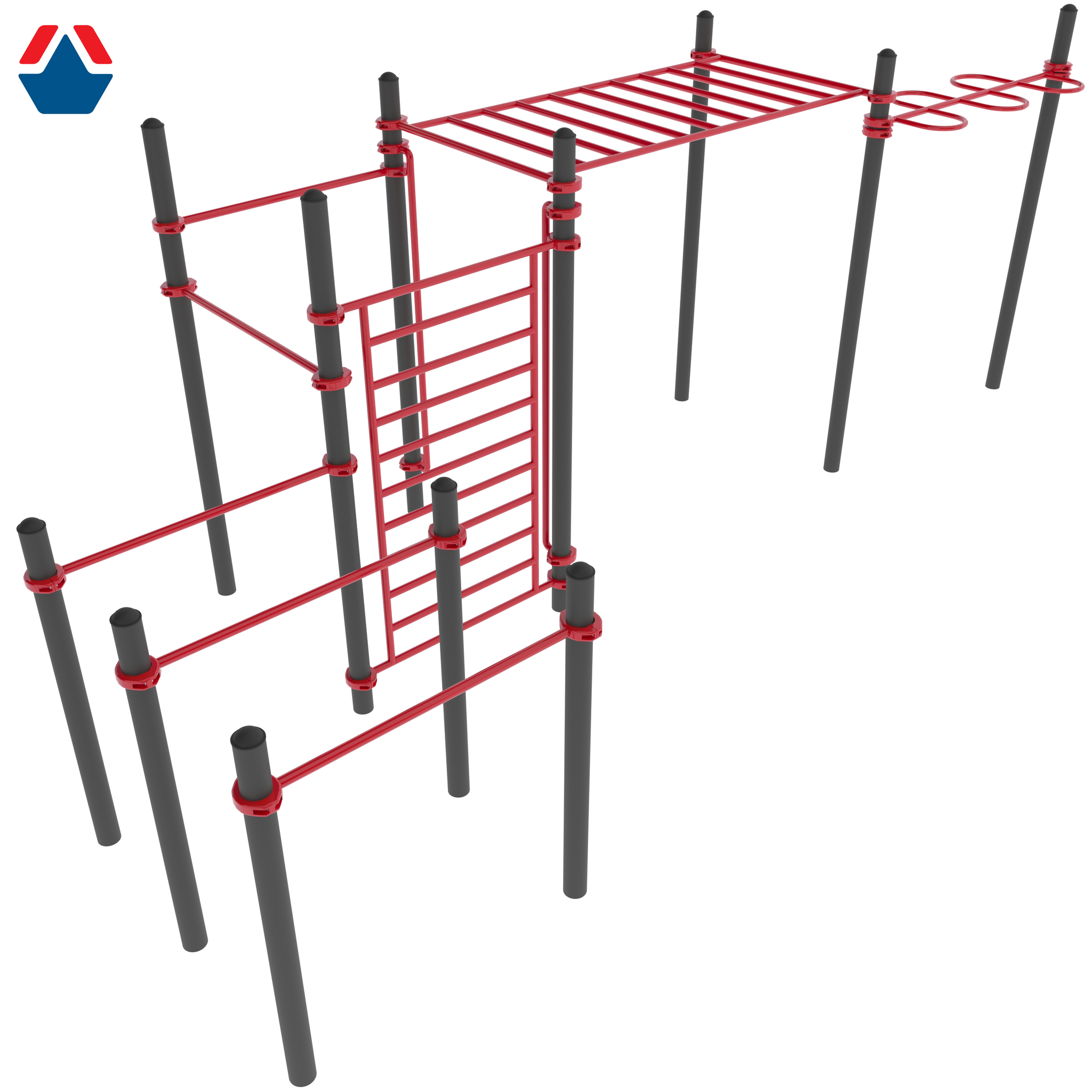 Комплекс включает в себя все основные снаряды для занятий уличным фитнесом – воркаутом. В его состав входят 12 опорных столбов (круглые стальные трубы с толстыми стенками) высотой от 1500 мм до 2600 мм, к которым посредством металлических хомутов прикрепляются такие элементы: