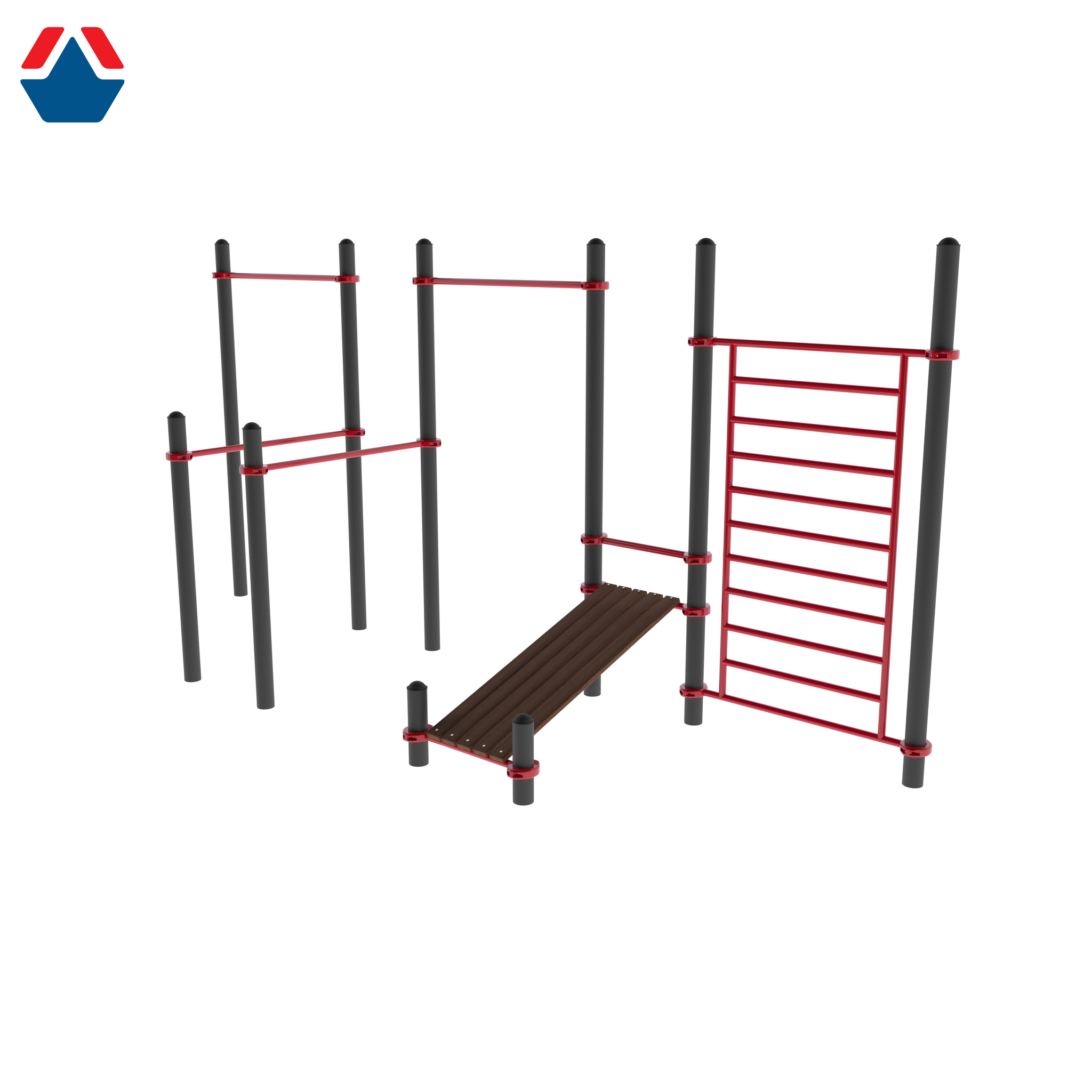 В состав спортивного комплекса входят два турника классических, шведская стенка, доска наклонная и брусья классические.