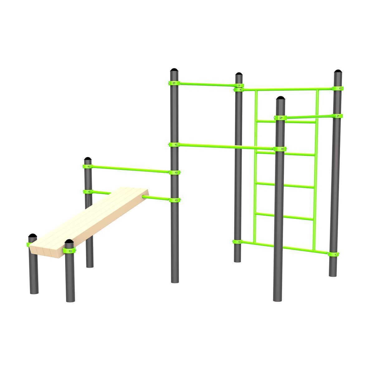 Перекладины шведской стенки и турников, перекладина на скамье выполнены из металлической трубы диаметром 34 мм с толщиной стенки 3,2 мм.