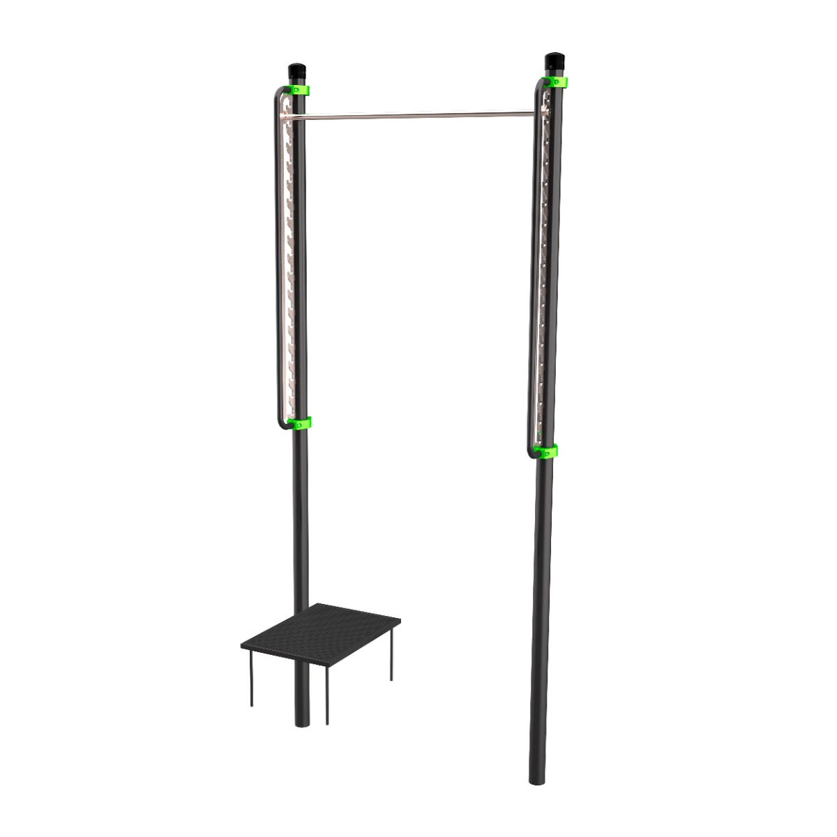 Высота турника-перекладины регулируется от 900 мм до 2600 мм (от уровня площадки) с шагом 100 мм.