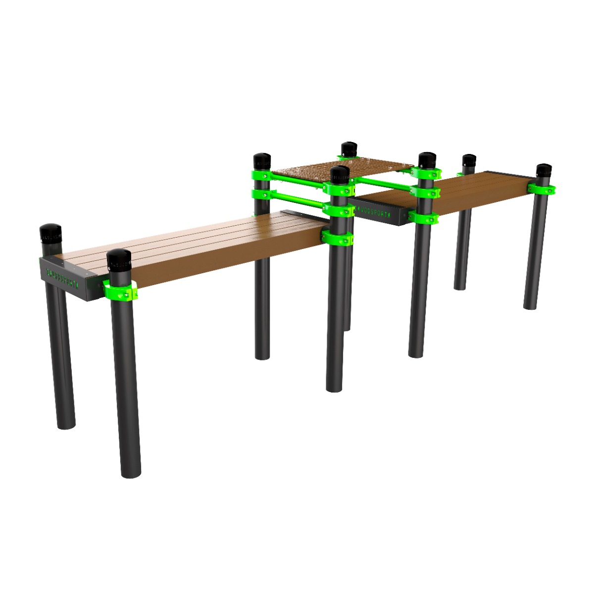 В состав комплекса входят две горизонтальные скамьи 1500×415×100 мм каждая. Скамьи выполнены из древесно-полимерного композита (ДПК), предназначенного для круглогодичной эксплуатации на открытом воздухе. Материал устойчив к воздействию влаги, ультрафиолетового излучения и перепадам температур, не подвержен гниению и не требует дополнительного обслуживания.