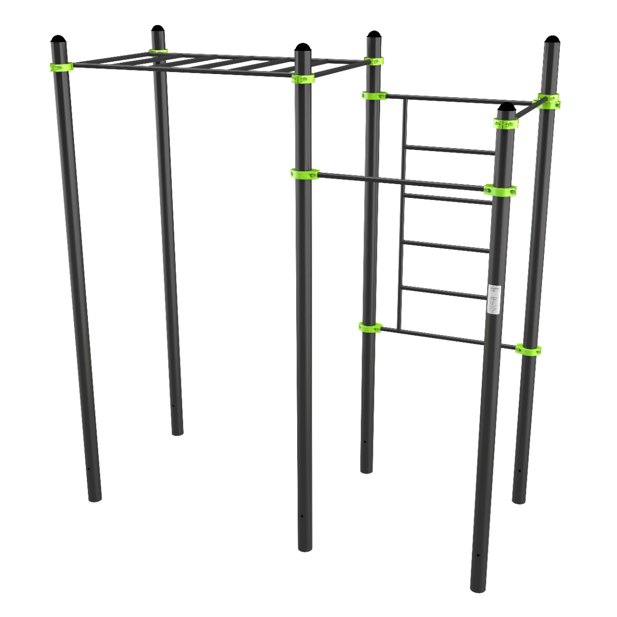 Перекладины турников, шведской стенки и горизонтального рукохода выполнены из металлической трубы диаметром 34 мм с толщиной стенки 3,2 мм.