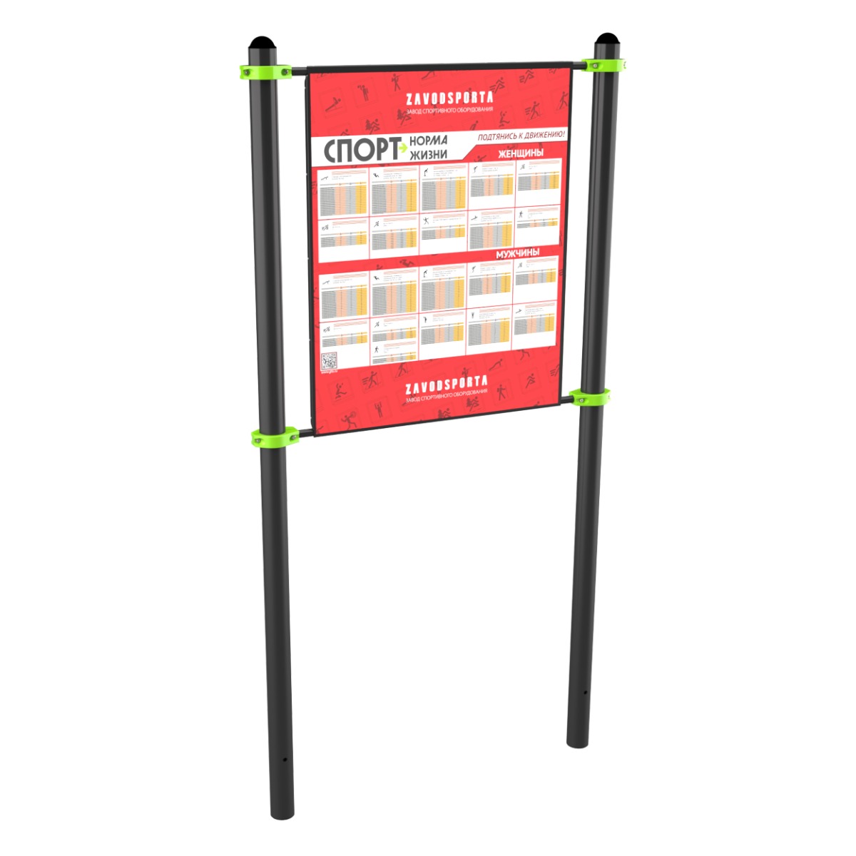 Уличная информационная стойка для описания нормативов испытаний (тестов) «ГТО» или нанесения прочей информации ZAVODSPORTA* предназначена для установки на уличных спортивных площадках с учетом эксплуатации в разных климатических условиях.