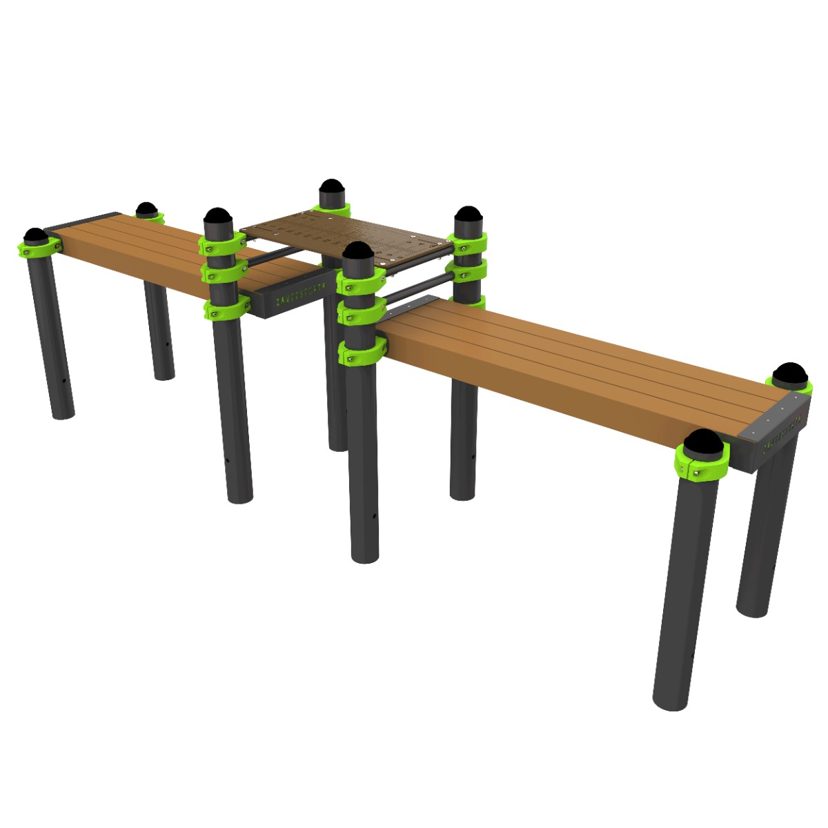 В состав комплекса входят две горизонтальные скамьи 1500×415×100 мм каждая. Скамьи выполнены из древесно-полимерного композита (ДПК), предназначенного для круглогодичной эксплуатации на открытом воздухе. Материал устойчив к воздействию влаги, ультрафиолетового излучения и перепадам температур, не подвержен гниению и не требует дополнительного обслуживания.