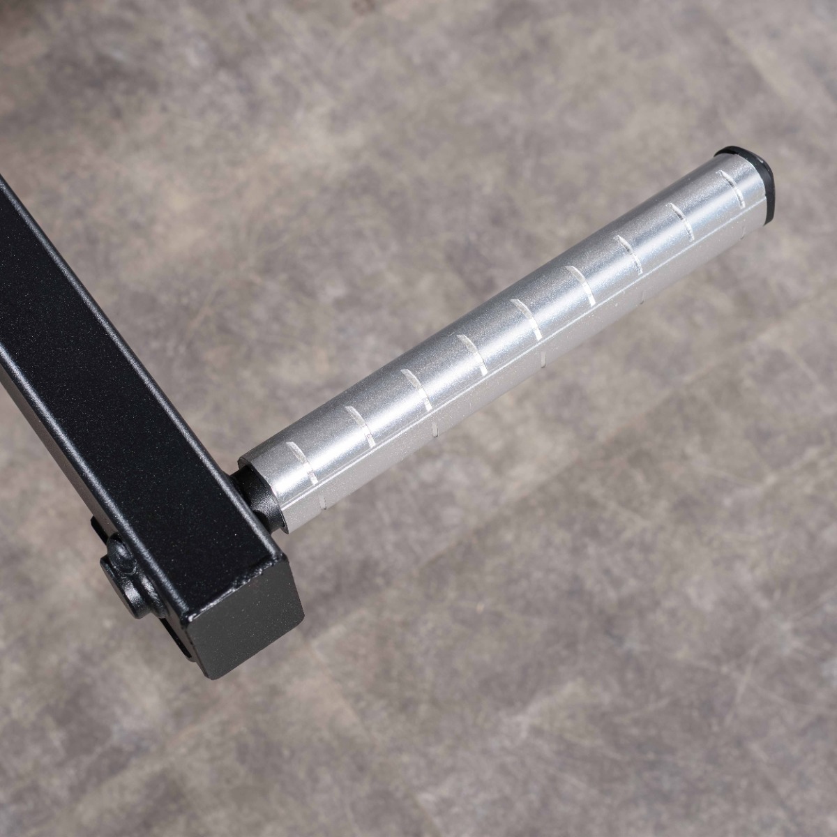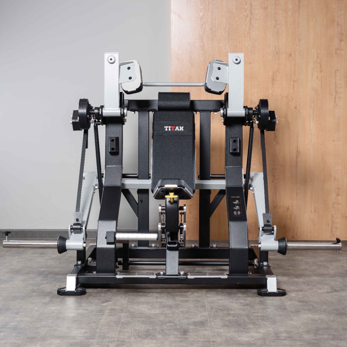 На подвижных рычагах для работы со свободными весами установлено два литых хромированных накопителя из толстостенной стальной трубы длиной 350 мм, рабочей длиной 320 мм (до ограничительного штифта) под диски Ø 50 мм.