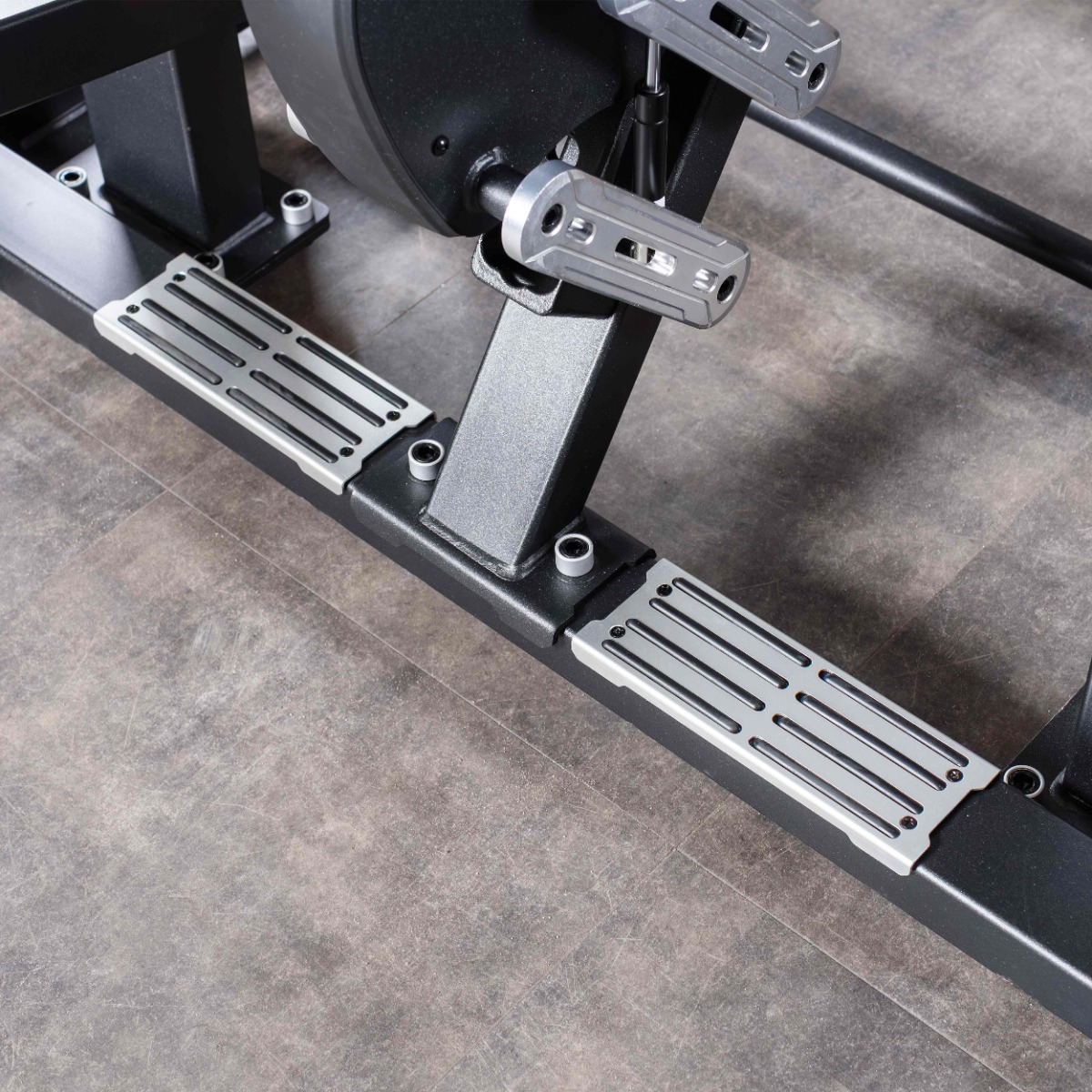Опорные ножки тренажера с отверстиями для крепления к полу, выполненные из листового металла с резиновыми подпятниками высотой 25 мм, обеспечивают устойчивость тренажера и предохраняют напольное покрытие от повреждений.