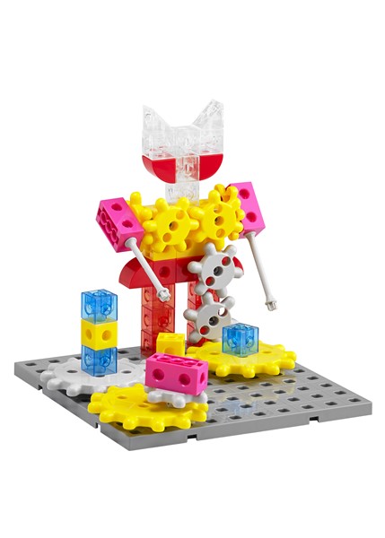 Набор включает в себя 113 деталей (кубики, шестеренки, оси, основание для кубиков и др.).