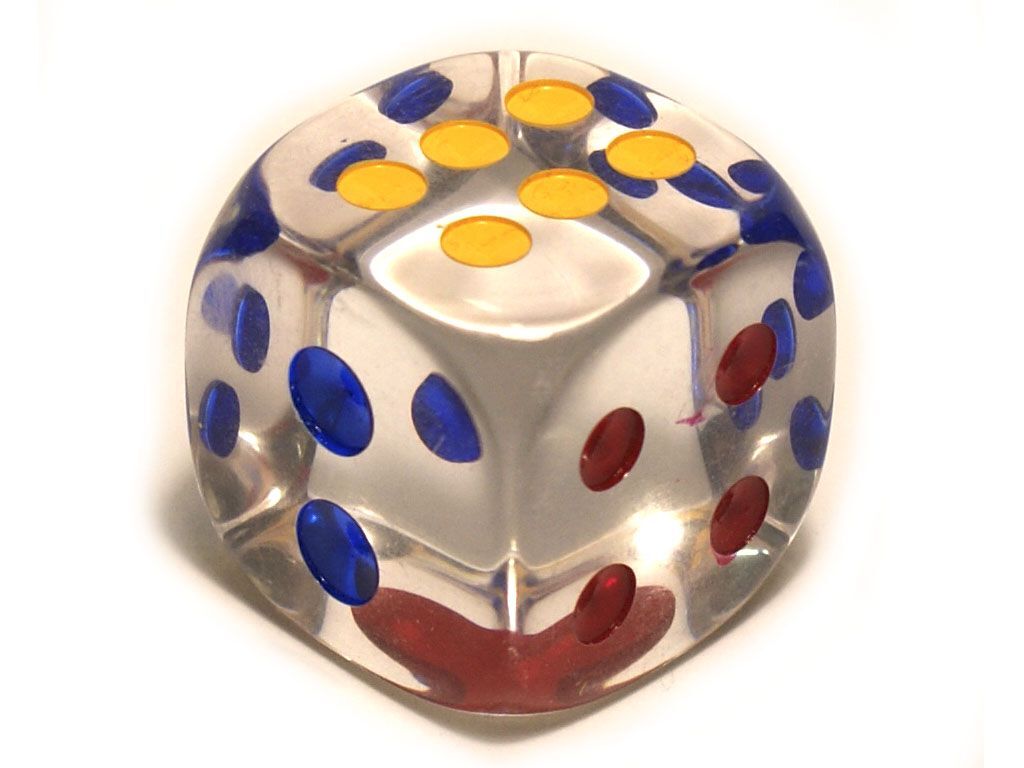 Стандартный кубик (кость, зарик) для игры в настольные игры, на шести гранях которого нанесены комбинации точек с числами (1, 2, 3, 4, 5, 6); сумма точек на противоположных гранях всегда составляет семь.
