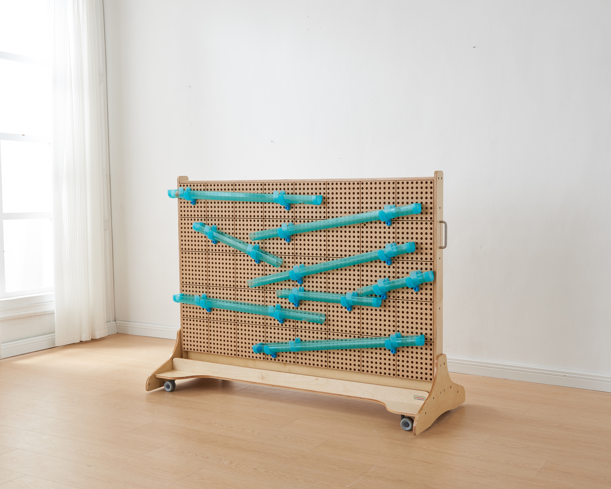 Игровой набор «Желоб для подачи воды/мяча» является дополнением к STEM стене, как к стационарной, так и передвижной. Набор состоит из 92 деталей, которые позволяют детям создавать бесконечное множество различных конфигураций на STEM стене. В комплект входят желоба разной длины, разноцветные шарики и набор для крепления к STEM-стене, а также различные компоненты, которые сделают путешествие шарика или воды более увлекательным: ветряные мельницы и водяные колёса, заглушки для воды и концевые колпачки, а также большая воронка для сбора воды или запуска шарика
